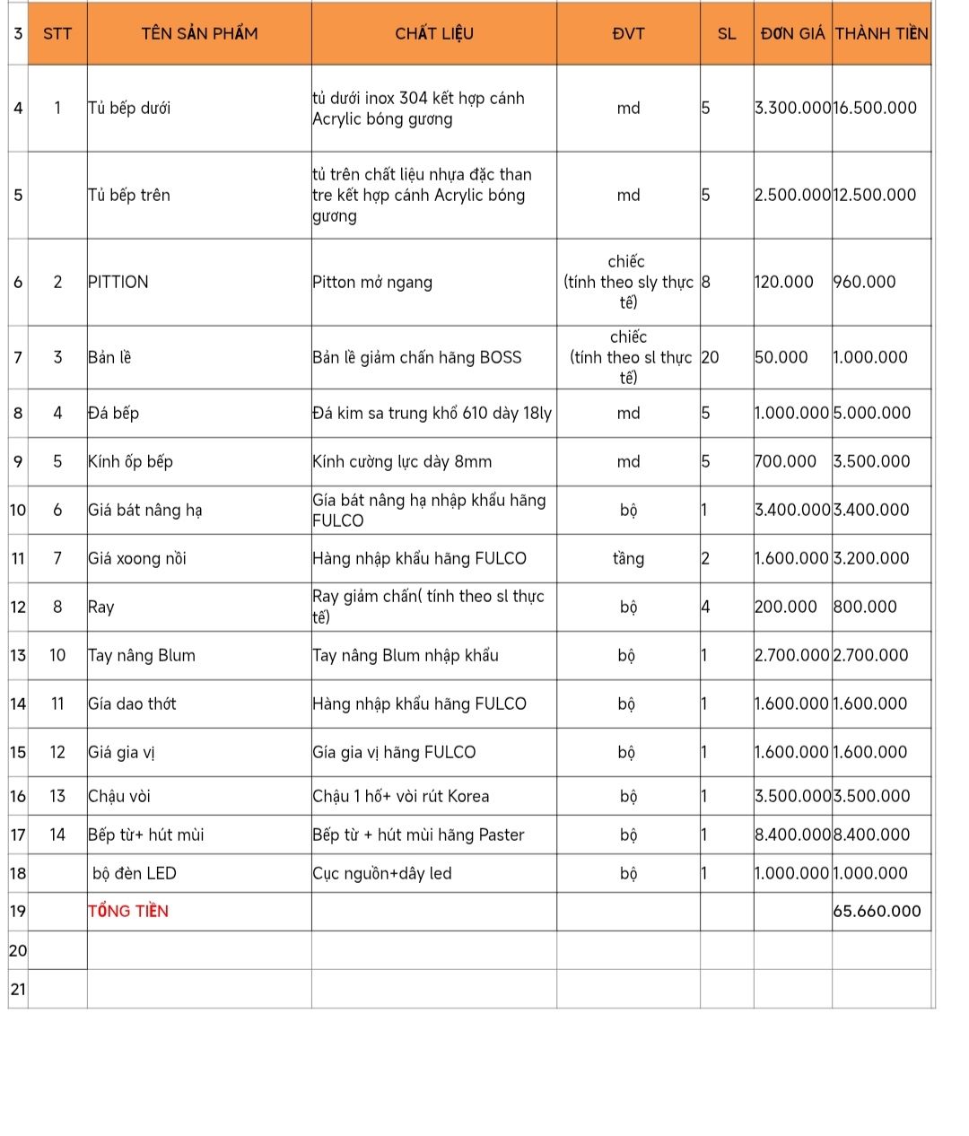 Các thông số về số lượng phụ kiện như 8 chiếc pitton, 20 bản lề BOSS và 4 bộ ray giảm chấn là số lượng dự toán dựa trên thiết kế thực tế để đảm bảo các cánh tủ và ngăn kéo vận hành êm ái. Phần thiết bị bao gồm đầy đủ các tiện nghi hiện đại từ hãng FULCO và Blum (như giá bát nâng hạ, tay nâng cánh tủ, giá dao thớt), giúp tối ưu hóa không gian sử dụng. Tổng chi phí 65.660.000 VNĐ đã bao gồm cả mặt đá kim sa, kính ốp tường và các thiết bị điện tử cơ bản như bếp từ, máy hút mùi và chậu vòi, tạo thành một gói thi công “chìa khóa trao tay” cho phòng bếp.