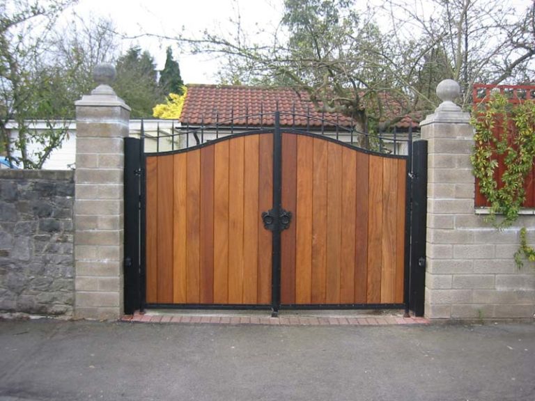 Nếu chất liệu gỗ khiến bạn thấy quá đơn điệu và nhàm chán thì bạ có thể kết hợp thêm khung sắt vào trong thiết kế cổng gỗ 2 cánh của mình. Khung sắt cùng với những họa tiết hoa văn sẽ tạ nên những điểm nhấn cho chiếc cổng, Ngoài ra, việc kết hợp khung sắt sẽ làm cho cổng gỗ đẹp trở nên bền hơn, khắc phục nhược điển của cổng gỗ thông thường đó chính là mối ghép giữa gỗ và bản lề.