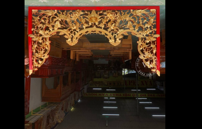 Bên trên là một bức Y môn. Bức Y môn đặc biệt ở chỗ, bên trong có các tấm gỗ đục hình Tùng, Cúc, Trúc, Mai, với độ rộng khoảng 30cm. Việc thiết kế được thực hiện vì không gian nhà chú khá cao, nếu chỉ có cửa võng thì có thể làm không gian dưới cảm thấy hơi chật. Để giải quyết điều, Skyhome thiết kế thêm Y môn giống như một bức tranh treovà giúp không gian thờ trở nên cân đối và thoải mái hơn.