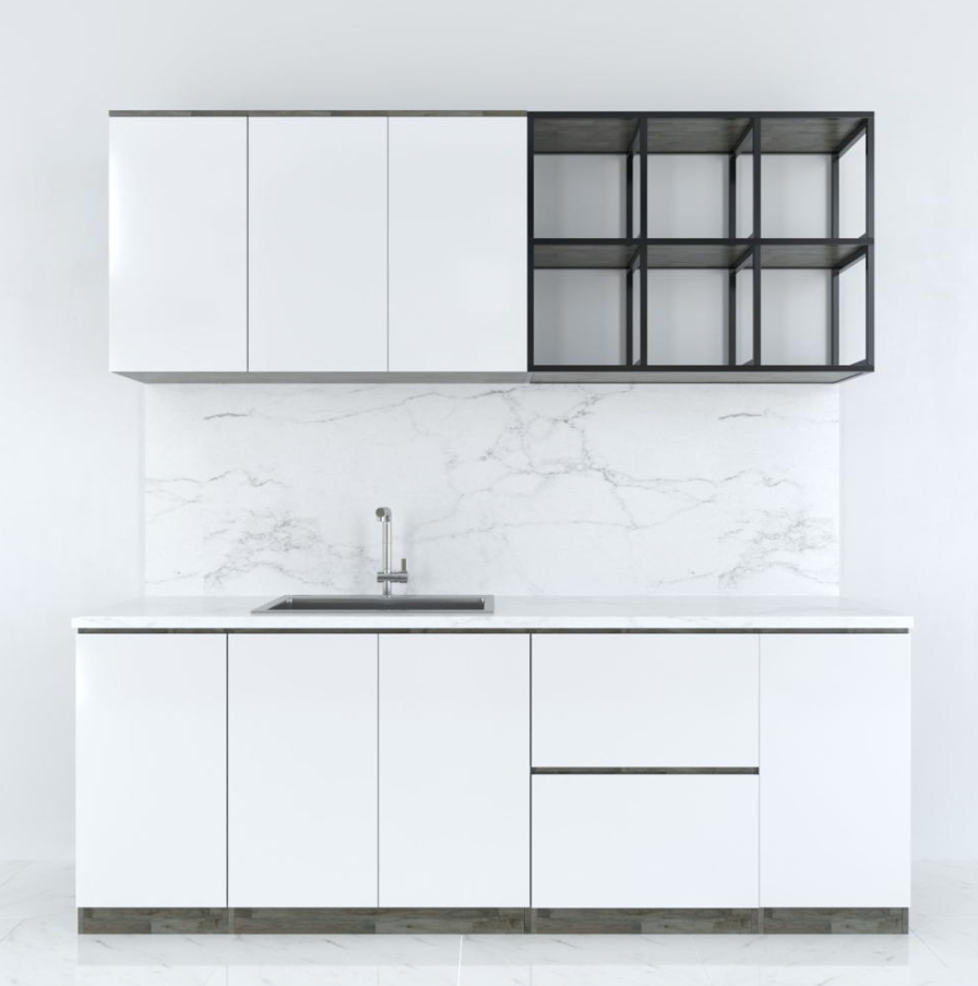Tủ bếp treo tường kết hợp khung cách tức là khung tủ không kéo dài từ đầu đến cuối tủ mà sẽ được cách ra để tạo không gian cho một đồ nội thất khác kết hợp vào.