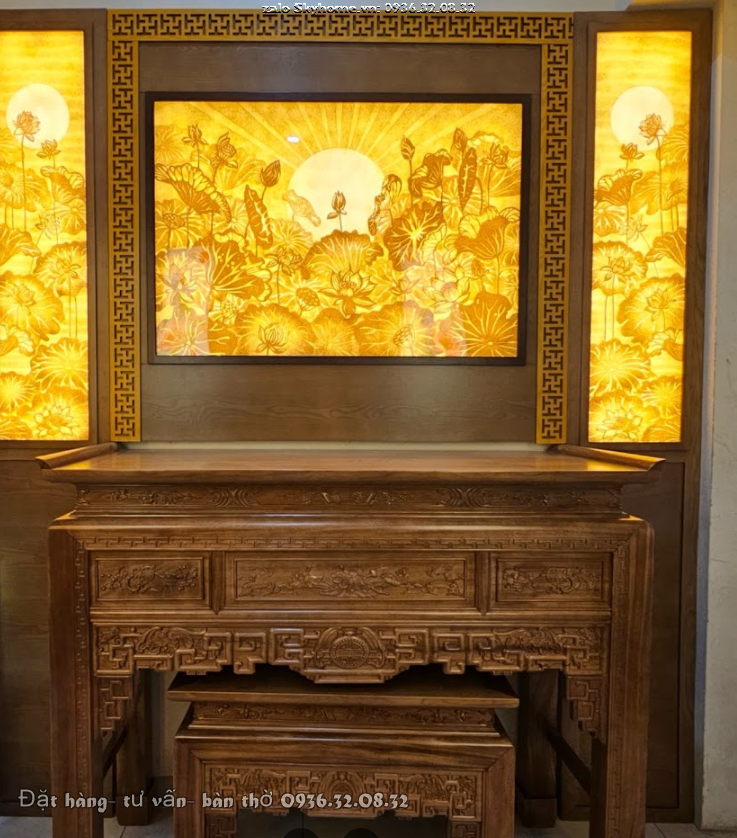 Tranh trúc chỉ phòng thờ hoa sen là biểu tượng cao quý trong Phật giáo, hoa sen đại diện cho sự giác ngộ và hành trình hoàn thiện.