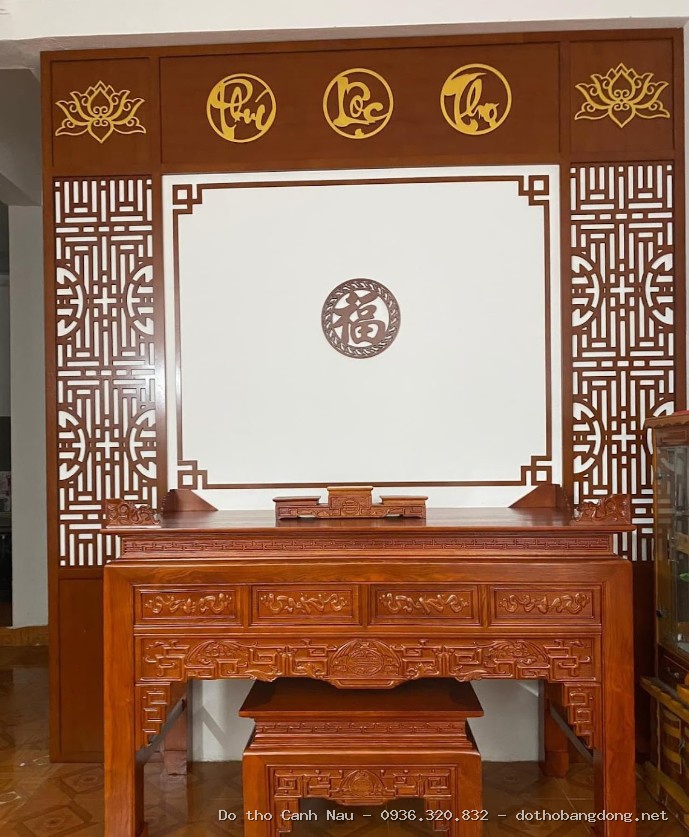 Trong gian giữa, điểm nhấn quan trọng nhất chính là bức đại tự treo cao. Những câu chữ thường được lựa chọn như “Đức Lưu Quang” hay “Uống Nước Nhớ Nguồn”, mang ý nghĩa sâu sắc về đạo hiếu và phúc lộc. Đại tự cần được thiết kế với kích thước cân đối so với không gian, để tạo nên sự uy nghiêm. Nếu không sử dụng cửa võng, gia chủ có thể treo bức hạ xà, tuy nhiên với nhà thờ cao ráo, việc làm hạ xà sẽ giúp không gian hài hòa hơn thay vì để cửa võng quá cao gây mất cân đối.