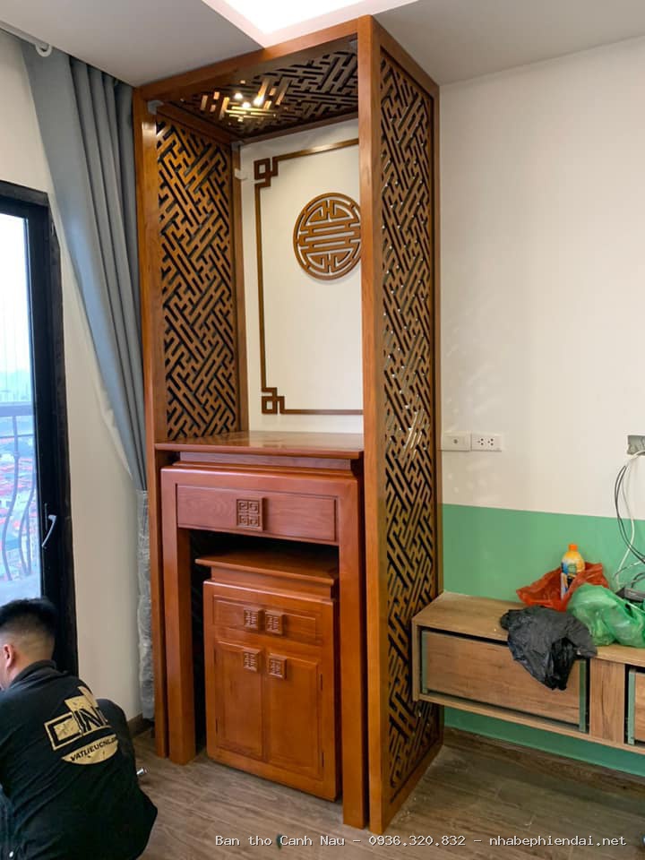 Ngay dưới hạ xà sẽ là bộ cửa võng – một chi tiết quan trọng trong nội thất nhà thờ gỗ 3 gian. Tôi đã chế tác cho bác chủ một bộ cửa võng nguyên khối dày 12 phân, với đường nét chạm trổ sắc sảo. Bề mặt được sơn son thếp vàng, tỏa sáng rực rỡ và tạo không khí trang trọng cho gian thờ. Hai bên cửa võng thường đi kèm với câu đối lòng máng chín chữ, tùy theo sở thích của gia chủ. Nếu cần, tôi luôn sẵn sàng gửi kèm nhiều mẫu câu đối để các bác tham khảo và chọn lựa.