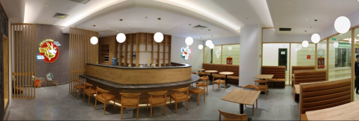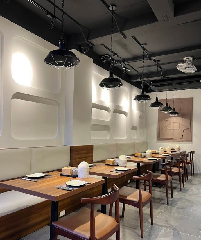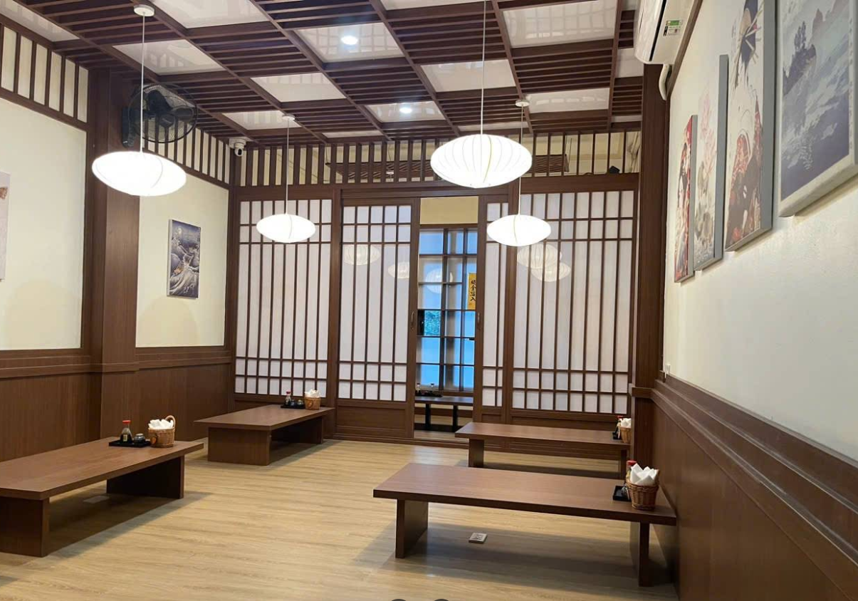 - Thái Sushi Nhật: Mặt tiền nổi bật với lam nhựa giả gỗ, mái ngói nhựa, đèn lồng và chữ mica phát sáng. Nội thất sử dụng trần sơn, lam MDF phủ melamine, sàn nhựa giả gỗ, hệ thống chiếu sáng khoa học. Không gian linh hoạt, phù hợp nhóm khách khác nhau.