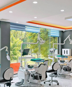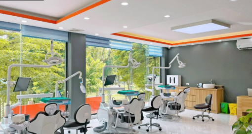 Khu lễ tân được thiết kế rộng rãi với quầy tiếp nhận gọn gàng, logo thương hiệu nổi bật và hệ thống ánh sáng trắng tinh tế, tạo cảm giác tin cậy ngay từ khi bước vào. Phòng khám và điều trị được trang bị đầy đủ thiết bị nha khoa hiện đại, nội thất đạt chuẩn an toàn, màu sắc chủ đạo trắng – xanh tạo sự sạch sẽ, chuyên nghiệp. Khu vực chờ của phòng khám được bố trí ghế ngồi thoải mái, trang trí nhẹ nhàng bằng cây xanh và tranh tường, giúp khách hàng thư giãn trong lúc đợi.
