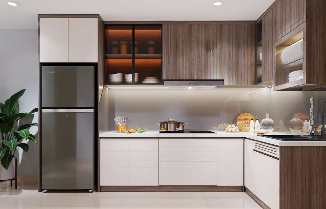 Tủ bếp màu trắng nâu có tủ bếp trên màu trắng và hệ tủ bếp dưới màu nâu. Kết hợp cùng hệ thống đèn led và hệ thống đèn chiếu sáng của phong tạo nên tổng thể căn bếp sang trọng, gọn gàng và không kém phần tinh tế. Vật liệu lí tưởng lựa chọn là gỗ công nghiệp phủ Lamintae hoặc gỗ công nghiệp phủ Veneer mang tới không gian nhà bếp trẻ trung và hiện đại. Không cong vênh co ngóp trong quá trình sử dụng, rất phù hợp trong môi trường điều hòa. Gỗ công nghiệp có khả năng chống ẩm cao, chống mối mọt tốt. Tủ bếp làm bằng gỗ công nghiệp có khả năng chịu lực và chịu thay đổi nhiệt tốt, độ bám vít cao. Hơn nữa tủ bếp gỗ công nghiệp an toàn không gây độc hại khi sử dụng. Giá thành rẻ, phù hợp với túi tiền của mọi nhà.