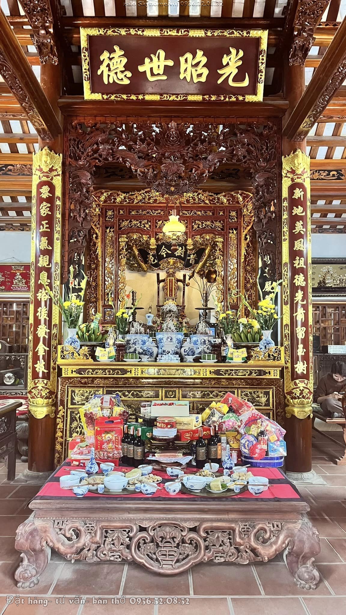 Phần Bức Đại Tự nằm ở vị trí cao nhất trong từ đường, là điểm nhấn trang nghiêm và linh thiêng nhất của không gian thờ cúng. Hiện tại, bức Đại Tự đang trong quá trình hoàn thiện và dự kiến sẽ được lắp đặt trong vài ngày tới. Sau khi hoàn tất toàn bộ công trình, bao gồm sơn son thếp vàng và bố trí đầy đủ các vật phẩm thờ cúng, chúng tôi sẽ trình bày chi tiết cách sắp xếp bát hương, đồ trang trí và các vật phẩm thờ cúng trên bức Đại Tự.
