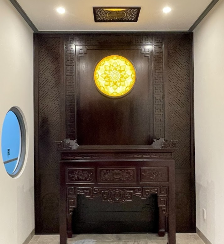 Mẫu vách ngăn hoa văn trang trí mang thiết kế đa dạng hơn, khách hàng có thể đặt theo ý thích. Tuy nhiên, vì đây là không gian tâm linh, nên ưu tiên chọn họa tiết nhẹ nhàng, cổ điển, thường gặp nhất là hình hoa sen kết hợp màu gỗ tự nhiênvừa hiện đại vừa trang trọng. Khi chọn vách ngăn, cần dựa vào kích thước lỗ ban của bàn thờ để chọn chiều cao phù hợp. Chiều dài vách ngăn nên tương đương với chiều rộng bàn thờ hoặc phủ vừa đủ phần mép bên ngoài để đảm bảo thẩm mỹ và sự hài hòa tổng thể.